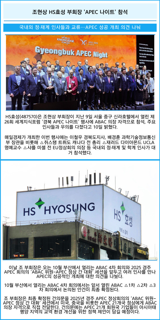 [프라임경제] HS효성(487570)은 조현상 부회장이 지난 9일 서울 중구 신라호텔에서 열린 제26회 세계지식포럼 '경북 APEC 나이트' 행사에 ABAC 의장 자격으로 참석, 주요 인사들과 우의를 다졌다고 10일 밝혔다.