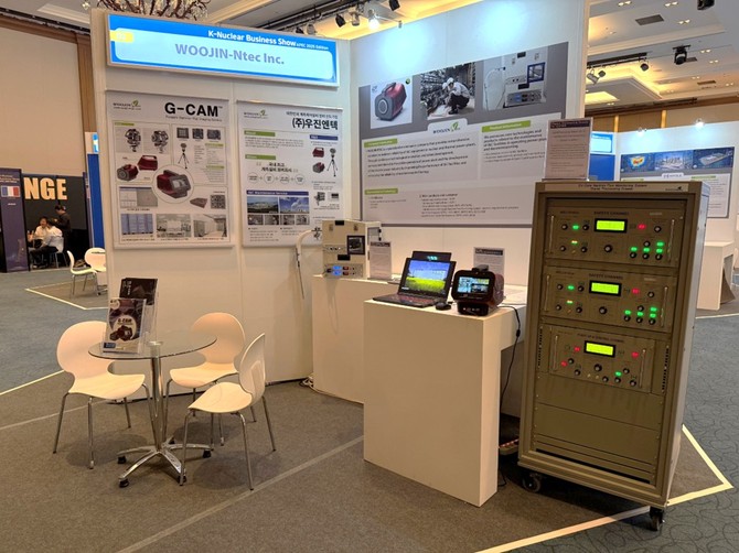 우진엔텍은 감마선 영상장비(G-CAM), 중수로 사용 후 핵연료 검증장비(OFPS), 노외중성자속감시시스템(ENFMS) 신호처리함 등 3개 핵심 제품을 전시했다.