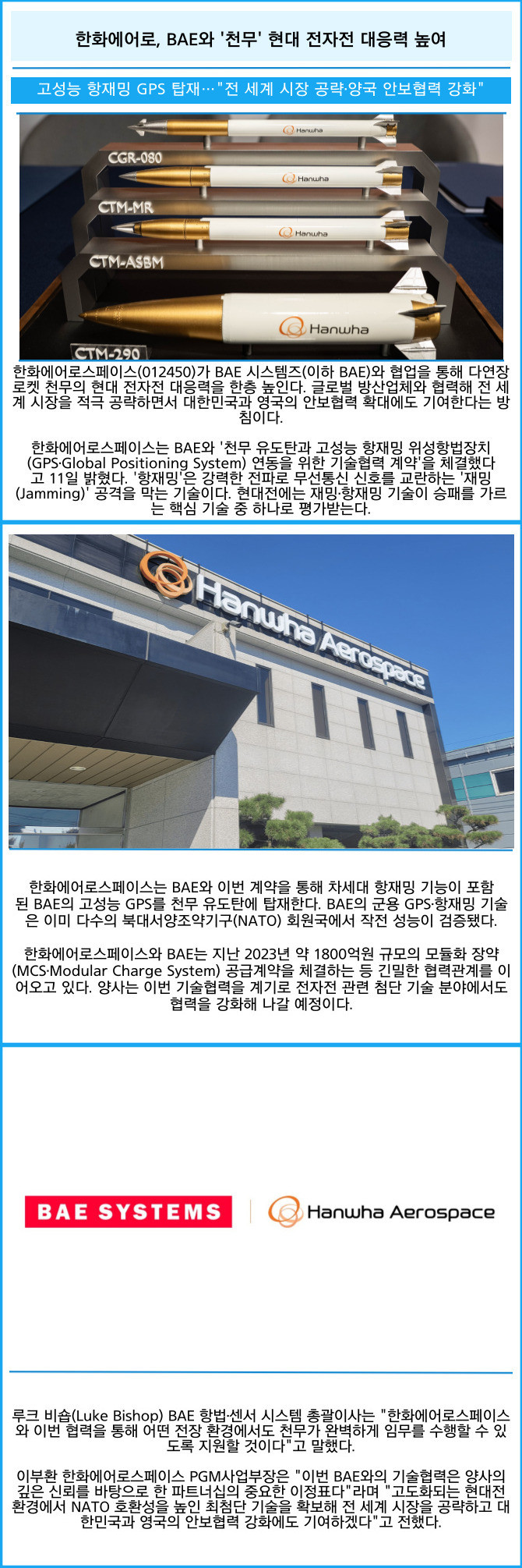 한화에어로스페이스는 BAE와 '천무 유도탄과 고성능 항재밍 위성항법장치(GPS·Global Positioning System) 연동을 위한 기술협력 계약'을 체결했다고 11일 밝혔다.