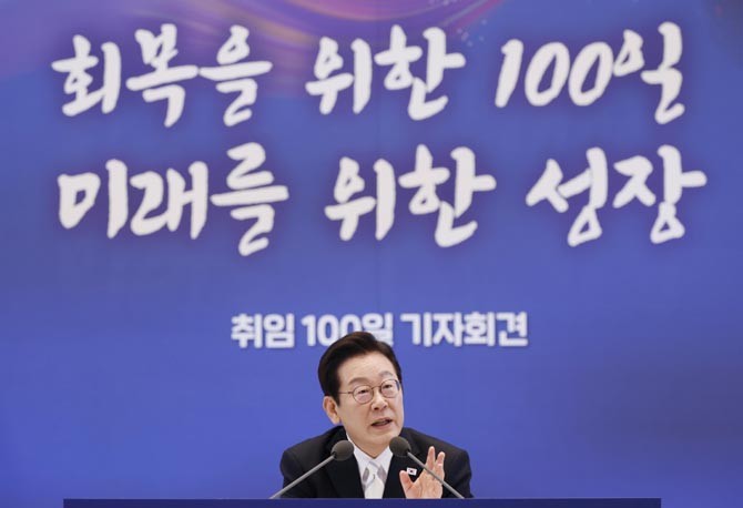 이 대통령은 이날 청와대 영빈관에서 '회복을 위한 100일, 미래를 위한 성장'이라는 슬로건으로 주재한 취임 100일 기자회견에서 "무너진 나라를 기초부터 다시 닦아 세운다는 마음으로 민주공화국 대한민국의 대통령으로 취임해 국정에 임한 지 이제 100일이 됐다"며 이같이 말했다.