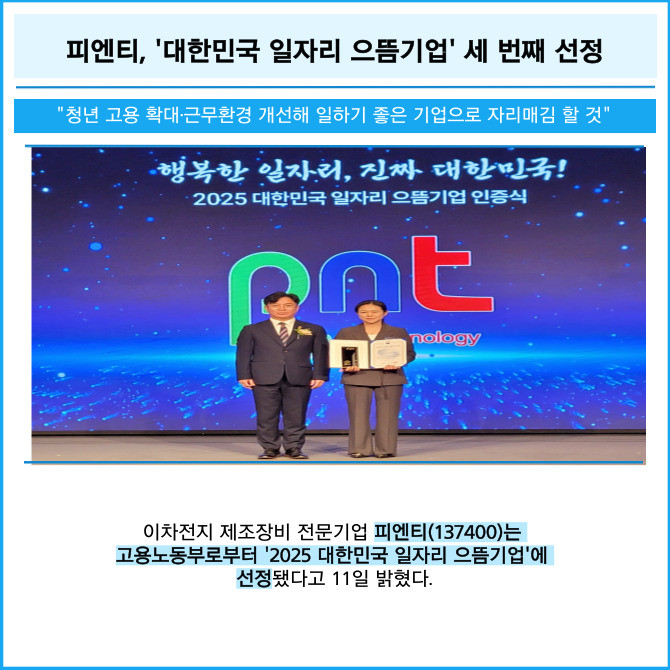 [프라임경제] 이차전지 제조장비 전문기업 피엔티(137400)는 고용노동부로부터 '2025 대한민국 일자리 으뜸기업'에 선정됐다고 11일 밝혔다.