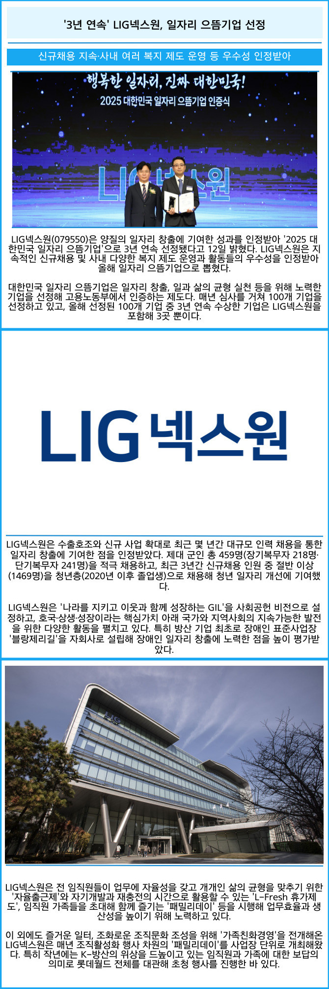 [프라임경제] LIG넥스원(079550)은 양질의 일자리 창출에 기여한 성과를 인정받아 '2025 대한민국 일자리 으뜸기업'으로 3년 연속 선정됐다고 12일 밝혔다. LIG넥스원은 지속적인 신규채용 및 사내 다양한 복지 제도 운영과 활동들의 우수성을 인정받아 올해 일자리 으뜸기업으로 뽑혔다.