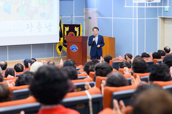 군수는 노인대학 특강에서 남해군의 다양한 매력을 함께 공유하는 한편, 노년기에 건강하고 행복한 마음가짐을 유지하는 방법을 소개했다.