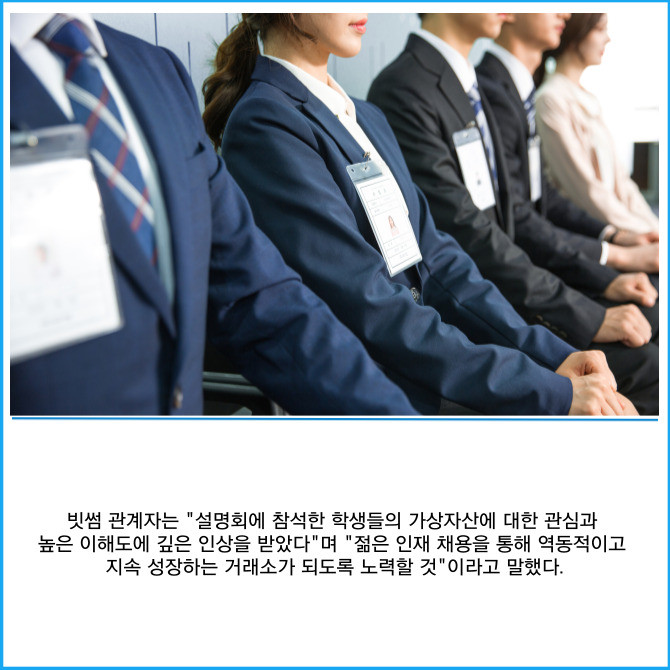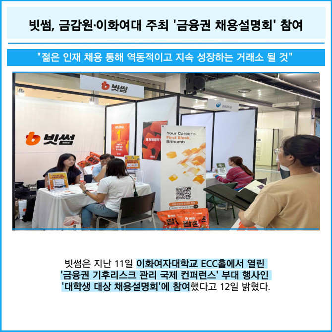 [프라임경제] 빗썸은 지난 11일 이화여자대학교 ECC홀에서 열린 '금융권 기후리스크 관리 국제 컨퍼런스' 부대 행사인 '대학생 대상 채용설명회'에 참여했다고 12일 밝혔다.