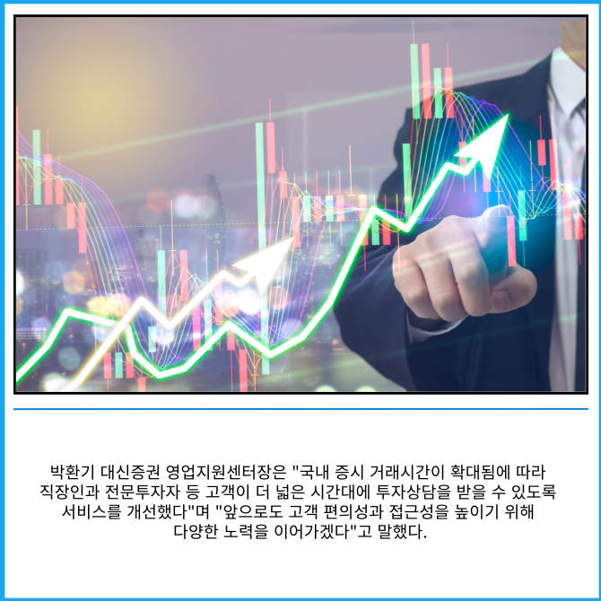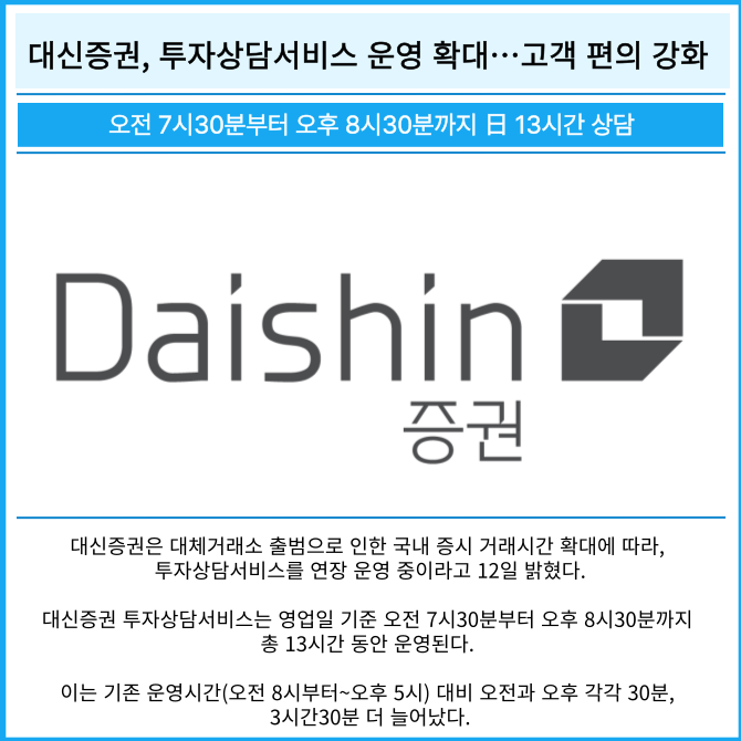 대신증권 투자상담서비스는 영업일 기준 오전 7시30분부터 오후 8시30분까지 총 13시간 동안 운영된다.