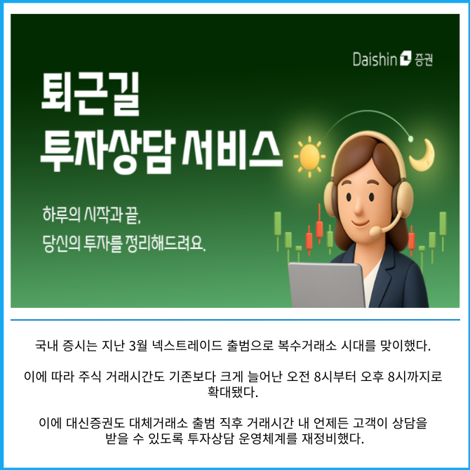 [프라임경제] 대신증권(003540)은 대체거래소 출범으로 인한 국내 증시 거래시간 확대에 따라, 투자상담서비스를 연장 운영 중이라고 12일 밝혔다.