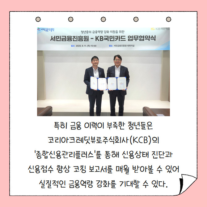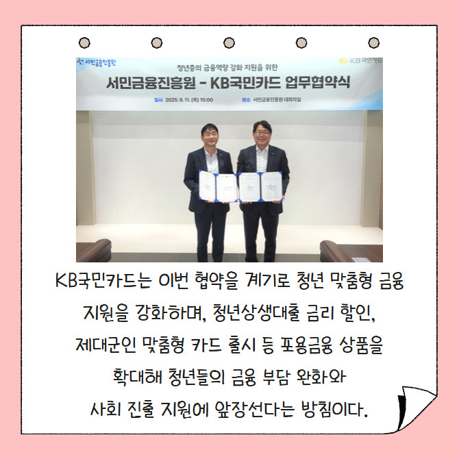 [프라임경제] KB국민카드는 지난 11일 서민금융진흥원과 업무협약(MOU)을 체결하고 청년층의 금융 이해력 제고와 접근성 확대를 위한 협력 활동에 나선다고 12일 밝혔다. 이번 협약을 통해 신용관리 서비스 제공, 금융컨설팅 연계 지원, 공동 홍보 등 다양한 프로그램이 추진된다.