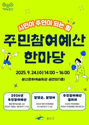 [프라임경제] 광주 광산구가 오는 24일 광산문화예술회관에서 '시민이 주인이 되는 힘, 주민참여예산'을 주제로 '2025 주민참여예산 한마당'을 연다.