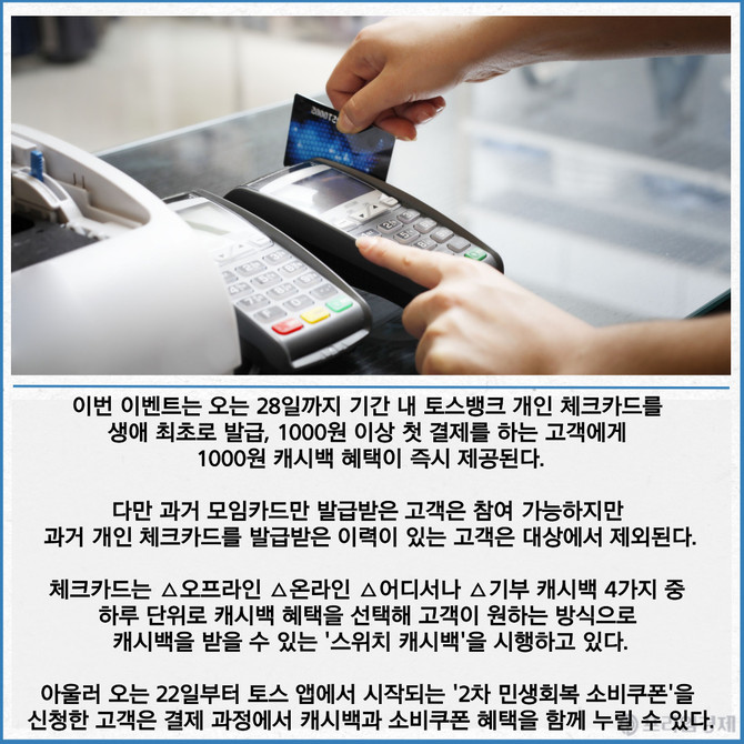 [카드] 토스뱅크, 체크카드 신규 고객 대상 캐시백 이벤트
