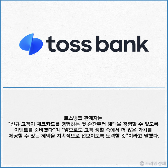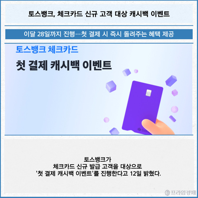 [프라임경제] 토스뱅크가 체크카드 신규 발급 고객을 대상으로 '첫 결제 캐시백 이벤트'를 진행한다고 12일 밝혔다.