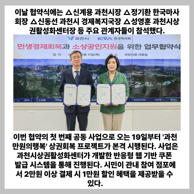 양 기관은 지난 11일 과천시청에서 '민생경제 회복 및 소상공인 지원을 위한 업무협약'을 체결했다고 12일 밝혔다.