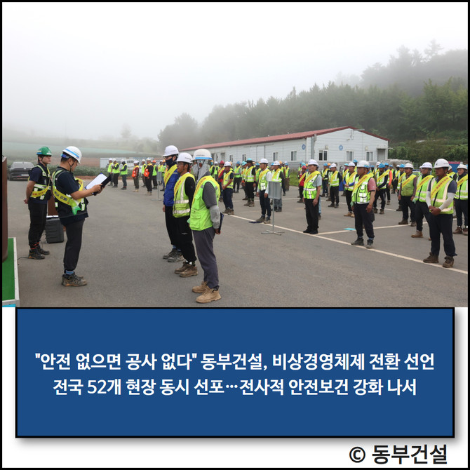 동부건설(005960)은 정부의 안전 강화 기조에 발맞춰 안전보건 관리 활동을 한층 강화한다. 이를 위해 동부건설은 전국 52개 현장에서 '안전보건 비상경영체제 선포식'을 개최했다고 12일 밝혔다. 이 자리에는 윤진오 대표이사를 포함한 본사·현장 임직원이 참여했다.