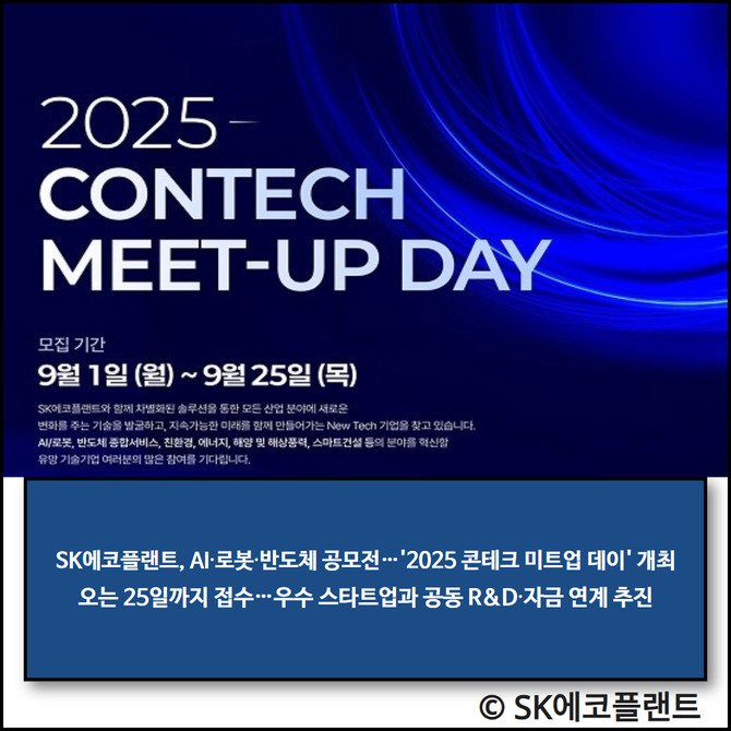SK에코플랜트는 인공지능(AI)·로봇·반도체 분야의 혁신 기술을 보유한 스타트업과 중소·중견기업을 대상으로 오픈 이노베이션 공모전 '2025 콘테크 미트업 데이(ConTech Meet-Up Day)'를 개최한다고 12일 밝혔다. 접수는 오는 25일까지 홈페이지를 통해 가능하다.