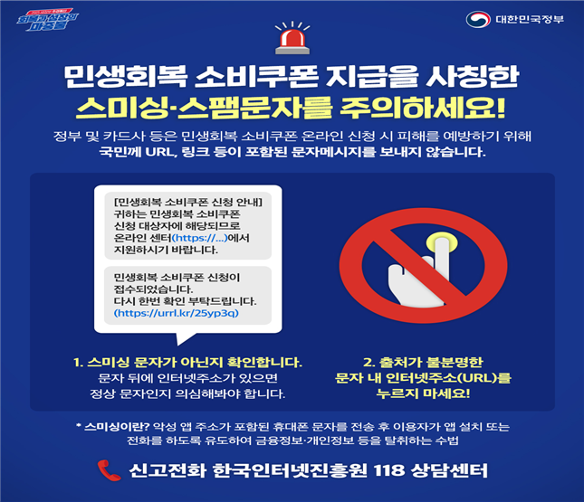 한편, 스미싱 피해를 사전 예방하기 위해 정부·카드사·지역화폐사는 2차 민생회복 소비쿠폰과 관련해 '인터넷 주소 바로가기(URL)'가 포함된 문자 및 SNS 안내문자를 일절 발송하지 않을 예정이다.