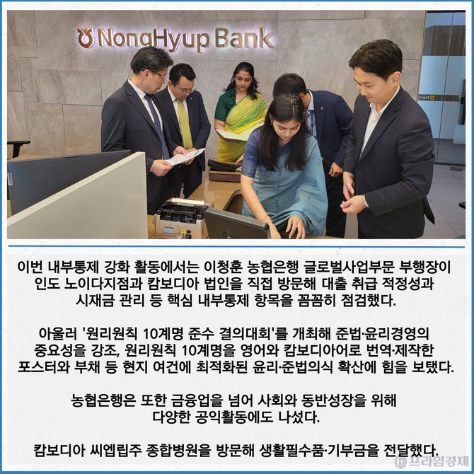 [프라임경제] NH농협은행이 해외 점포의 금융사고 발생을 방지하고 건전한 영업환경 조성을 위해 내부통제 강화 목적의 현장 점검을 시행했다고 15일 밝혔다.