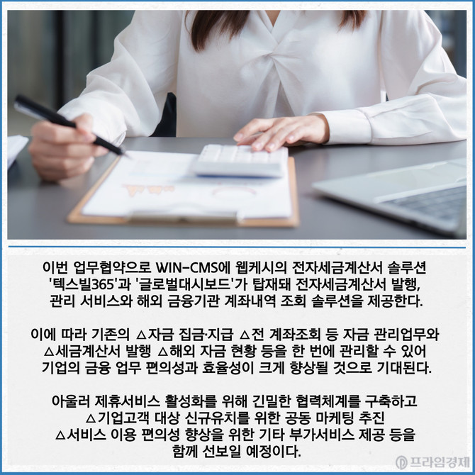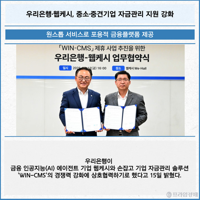 [프라임경제] 우리은행이 금융 인공지능(AI) 에이전트 기업 웹케시와 손잡고 기업 자금관리 솔루션 'WIN-CMS'의 경쟁력 강화에 상호협력하기로 했다고 15일 밝혔다.