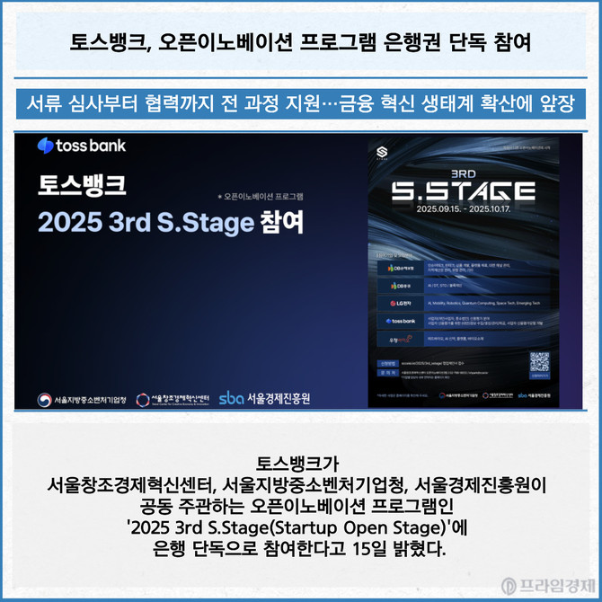 [프라임경제] 토스뱅크가 서울창조경제혁신센터, 서울지방중소벤처기업청, 서울경제진흥원이 공동 주관하는 오픈이노베이션 프로그램인 '2025 3rd S.Stage(Startup Open Stage)'에 은행 단독으로 참여한다고 15일 밝혔다.