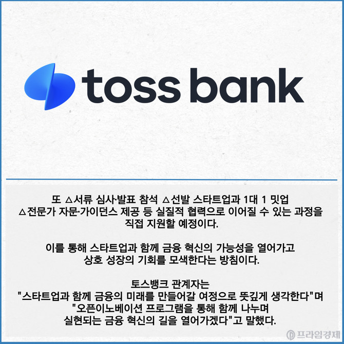 [카드] 토스뱅크, 오픈이노베이션 프로그램 은행권 단독 참여