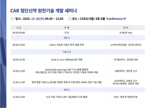 기술 분야로 정상원 엠브릭스 대표, 정준호 서울대 교수, 김동은 건국대 교수가 각 △Grab-in vivo mRNA@LNP 개발 △Switchable tag CAR-T시스템 활용 고형암 치료제 개발 △항체 접합 지질나노입자를 이용한 생체 내 CAR 발현 mRNA 전달 기술 개발을 발표한다.