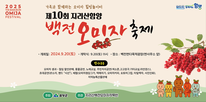 [프라임경제] 함양군 백전면에서 지역대표 특산물인 오미자를 주제로 한 '제10회 지리산함양 백전오미자축제'가 9월20일 백전면 다목적광장에서 개최한다.