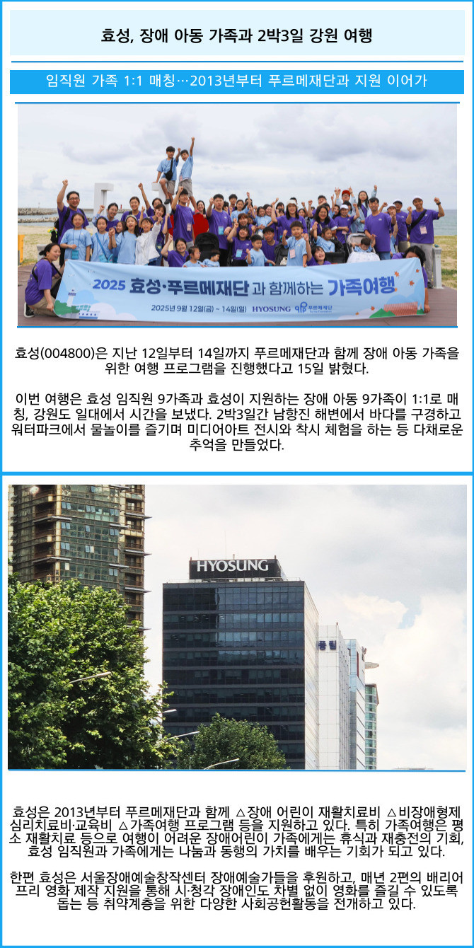 [프라임경제] 효성(004800)은 지난 12일부터 14일까지 푸르메재단과 함께 장애 아동 가족을 위한 여행 프로그램을 진행했다고 15일 밝혔다.