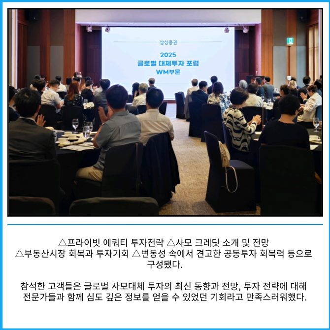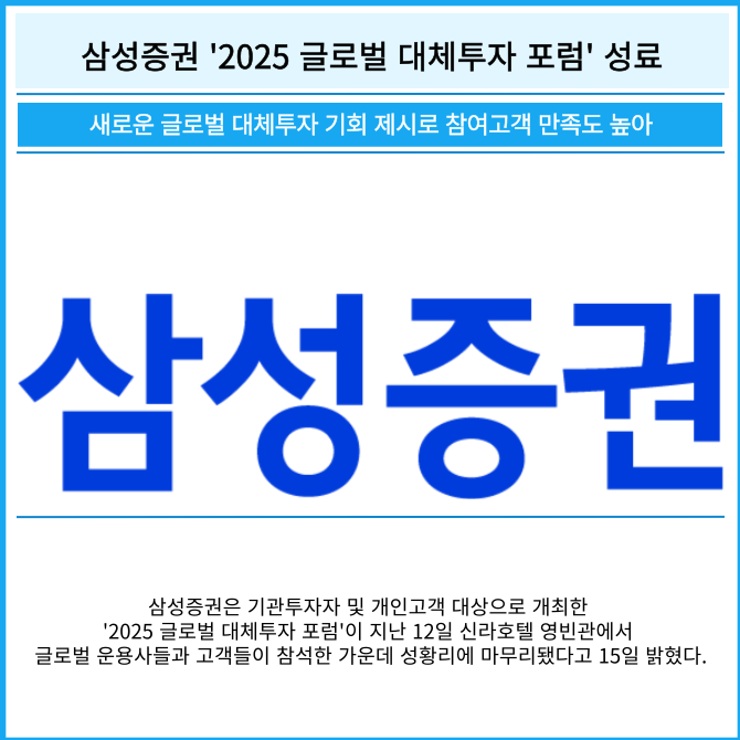 [프라임경제] 삼성증권(016360)은 기관투자자 및 개인고객 대상으로 개최한 '2025 글로벌 대체투자 포럼'이 지난 12일 신라호텔 영빈관에서 글로벌 운용사들과 고객들이 참석한 가운데 성황리에 마무리됐다고 15일 밝혔다.