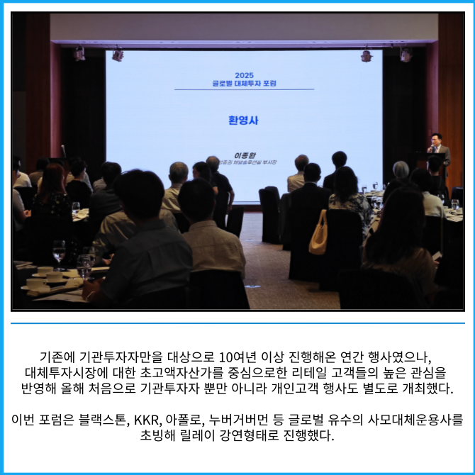 기존에 기관투자자만을 대상으로 10여년 이상 진행해온 연간 행사였으나, 대체투자시장에 대한 초고액자산가를 중심으로한 리테일 고객들의 높은 관심을 반영해 올해 처음으로 기관투자자 뿐만 아니라 개인고객 행사도 별도로 개최했다.
