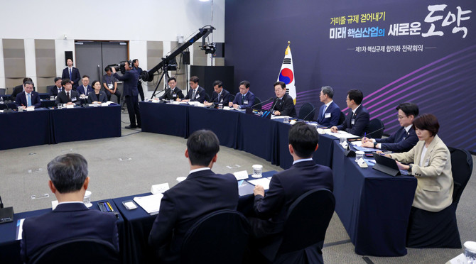 이 대통령은 이날 한국과학기술연구원 컨벤션 홀에서 열린 '제1차 핵심규제 합리화 전략회의'에서 "성장과 도약을 위해서는 우리가 자주 이야기 하는 것처럼 경제 활동의 발목을 잡고 있는 낡은 규제들을 혁신해야 된다"며 이같이 말했다.