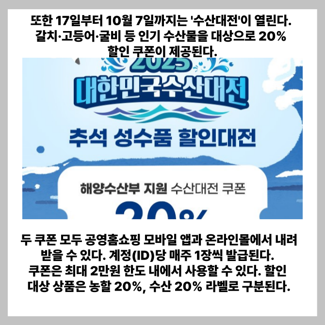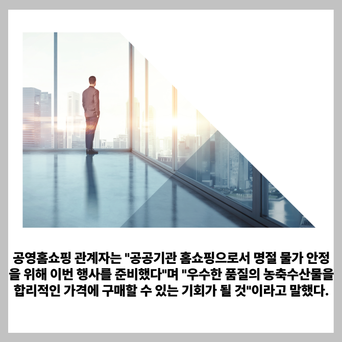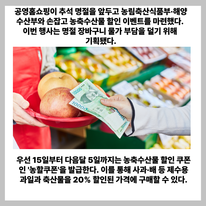 [프라임경제] 공영홈쇼핑이 추석 명절을 앞두고 농림축산식품부·해양수산부와 손잡고 농축수산물 할인 이벤트를 마련했다. 이번 행사는 명절 장바구니 물가 부담을 덜기 위해 기획됐다.