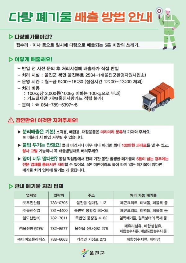 또한, 불법 투기나 지정된 장소 외 배출 시에는 최대 100만원의 과태료 또는 형사 고발 등의 조치가 이뤄질 수 있으며 자세한 사항은 울진군 환경자원사업소로 문의하면 안내받을 수 있다.