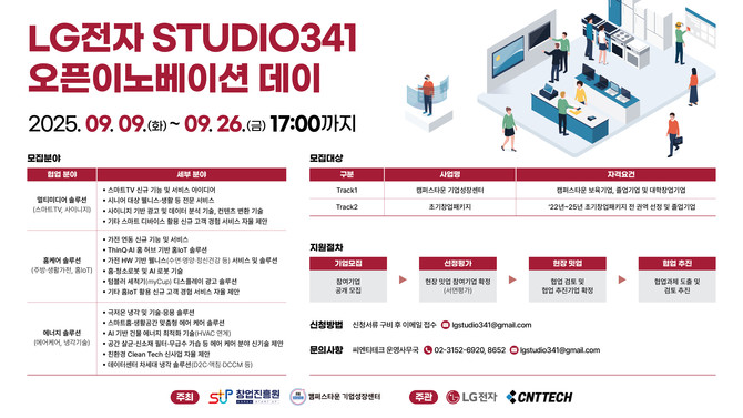 [프라임경제] 씨엔티테크(대표 전화성)가 LG전자(066570)와 공동으로 추진하는 오픈이노베이션 프로그램 'STUDIO341 오픈이노베이션 데이'의 참여 스타트업 모집을 시작했다.