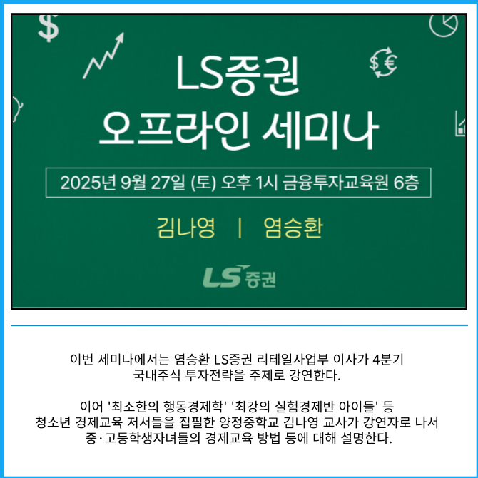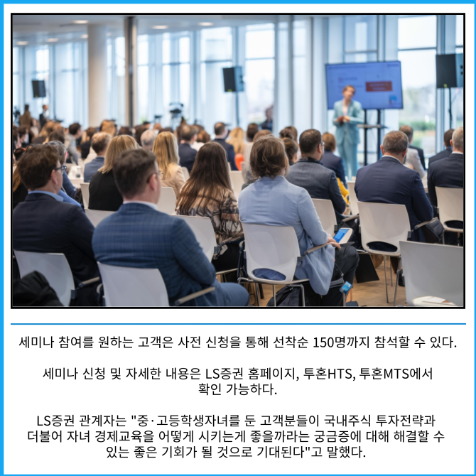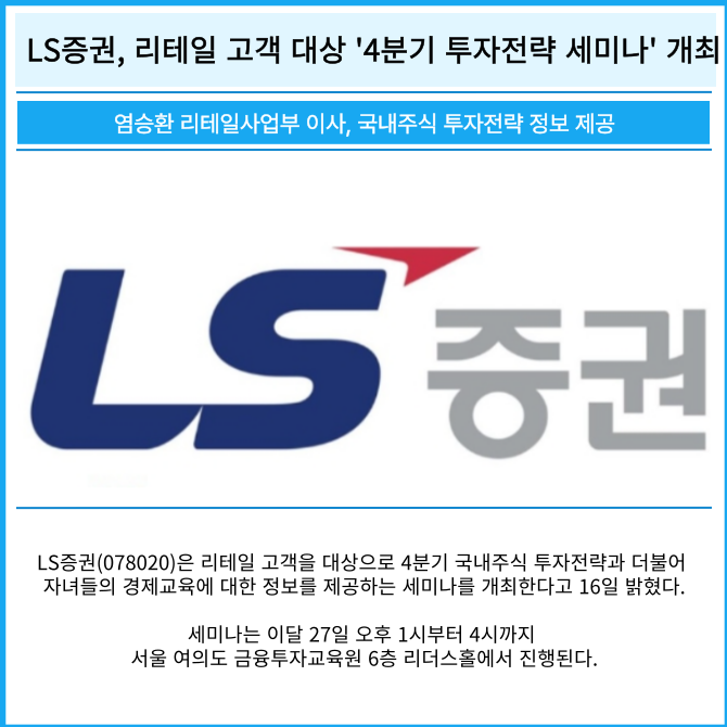 [프라임경제] LS증권(078020)은 리테일 고객을 대상으로 4분기 국내주식 투자전략과 더불어 자녀들의 경제교육에 대한 정보를 제공하는 세미나를 개최한다고 16일 밝혔다.