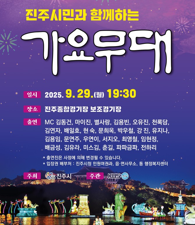[프라임경제] 진주시가 2025 진주 10월 축제의 시작을 알리는 'KBS 가요무대 특집 진주시편'이 9월29일 오후 7시30분 진주종합경기장 보조경기장에서 개최한다.