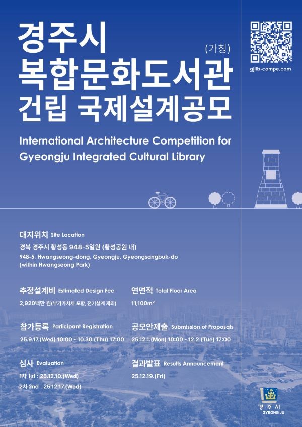 참가 등록은 오는 17일부터 10월30일까지 경주시 복합문화도서관 국제설계공모 홈페이지를 통해 가능하다.
