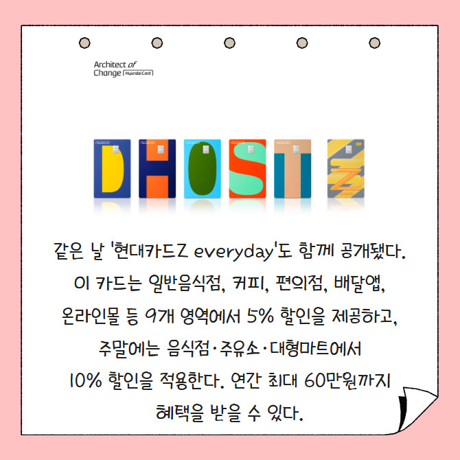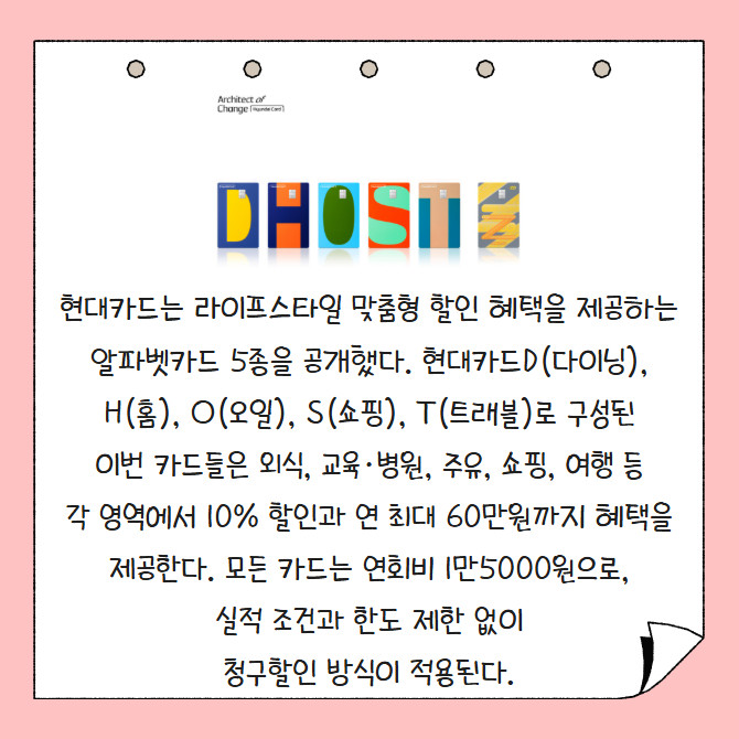 [프라임경제] 현대카드는 라이프스타일 맞춤형 할인 혜택을 제공하는 알파벳카드 5종을 공개했다. 현대카드D(다이닝), H(홈), O(오일), S(쇼핑), T(트래블)로 구성된 이번 카드들은 외식, 교육·병원, 주유, 쇼핑, 여행 등 각 영역에서 10% 할인과 연 최대 60만원까지 혜택을 제공한다. 모든 카드는 연회비 1만5000원으로, 실적 조건과 한도 제한 없이 청구할인 방식이 적용된다.