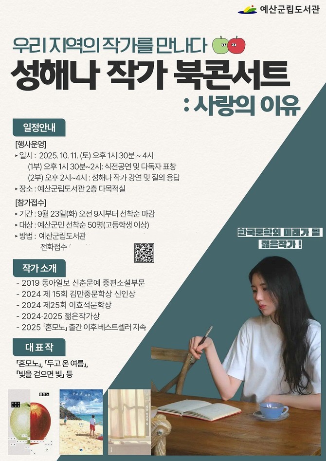■ 예산군립도서관, 성해나 작가 초청 '혼모노'와 함께하는 북콘서트 개최