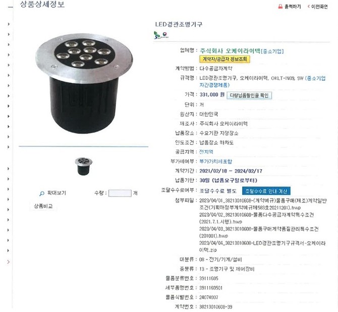 오케이라이텍이 산청군에 납품한 공사건명과 금액은 2023년도 △동의보감촌 야외전시시설 리뉴얼 전시물 경관조명 설치공사(3980만원) △십장생 공원 경관조명 조달구입(2214만원) 2024년도 △동의보감촌 경관조명등 보수공사(802만원)으로 총 6996만원이다.