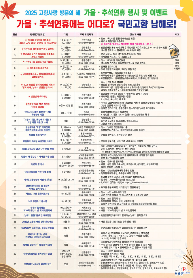 또한 군민의 날 및 화전문화제, 국민고향 남해 SNS 이벤트, 남해사랑상품권 화전 특별판매 시행, 남해몰 추석 할인전, 낭만남해 숙박대전, 낭만캠핑 페스타, 창생플랫폼 '고향' 기획전시, 자전거 대축전, 남해힐링숲타운 이벤트, 고향사랑 관광 정책 축제 등 전 세대와 취향을 아우르는 풍성한 행사와 이벤트가 이어진다. 연중 진행 중인 '택시관광가이드 인센티브' 지원사업, '남해여행 재방문 할인권' 등 다양한 인센티브 제도들도 활발하게 운영되고 있다.