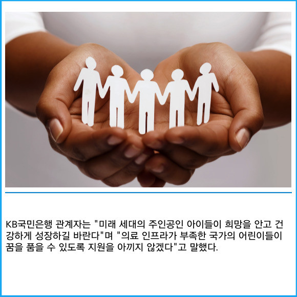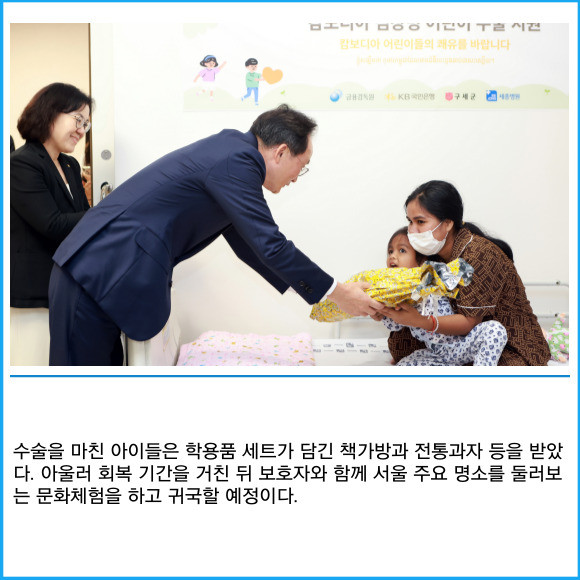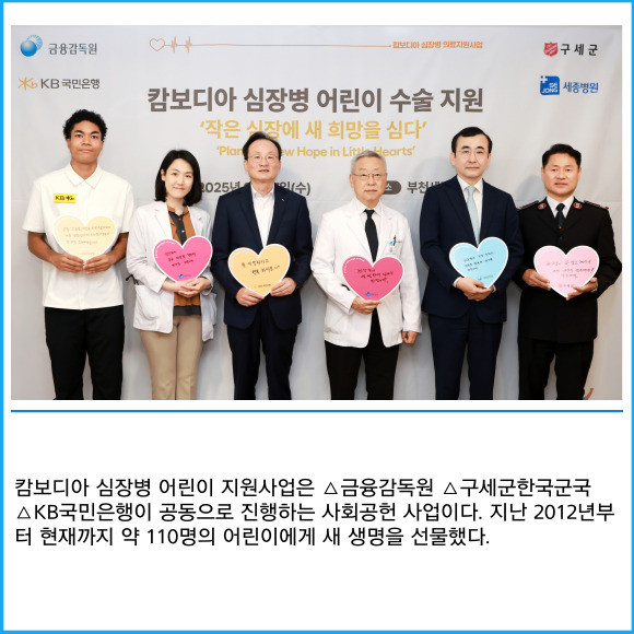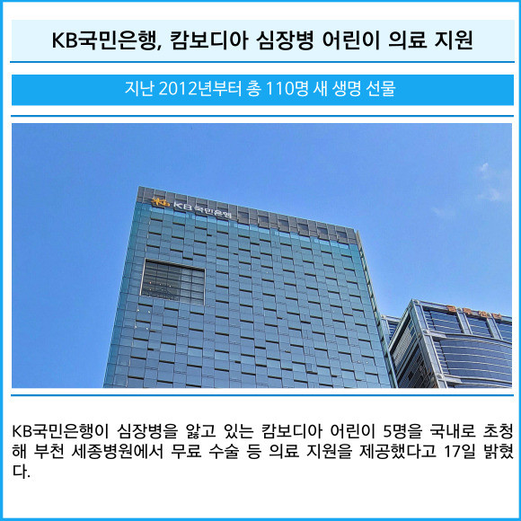 [프라임경제] KB국민은행이 심장병을 앓고 있는 캄보디아 어린이 5명을 국내로 초청해 부천 세종병원에서 무료 수술 등 의료 지원을 제공했다고 17일 밝혔다.
