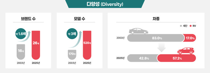 차종별로는 세단이 2003년 83%(1만9481대 중 1만6171대)를 차지했으나 2025년 8월 기준 42.8%로 절반 가까이 줄었다. 반대로 RV는 같은 기간 17%에서 57.2%로 치솟으며 명실상부한 시장 주력 차종으로 자리매김했다.