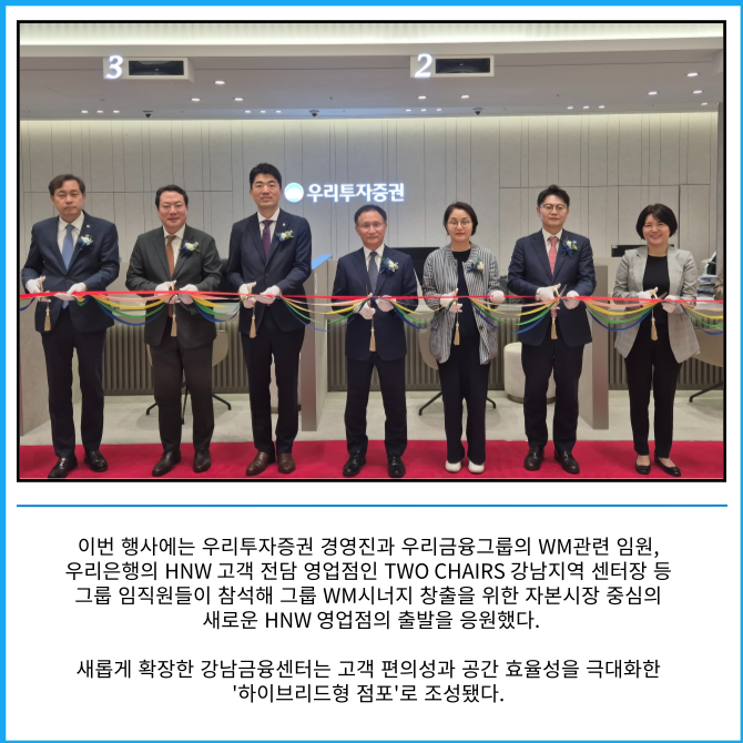 [프라임경제] 우리투자증권은 고액자산가(HNW) 고객에게 종합자산관리 솔루션을 제공하고자 강남금융센터를 확장 이전해 리뉴얼 오픈 행사를 진행했다고 17일 밝혔다.
