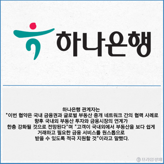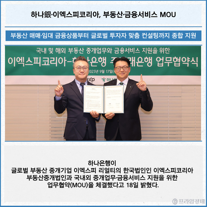 [프라임경제] 하나은행이 글로벌 부동산 중개기업 이엑스피 리얼티의 한국법인인 이엑스피코리아 부동산중개법인과 국내외 중개업무·금융서비스 지원을 위한 업무협약(MOU)을 체결했다고 18일 밝혔다.
