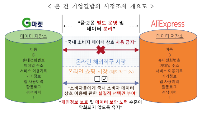 이에 따라 공정위는 △G마켓·옥션과 알리익스프레스의 독립 운영 △국내 소비자 데이터 기술적 분리 △소비자의 데이터 활용 선택권 보장 △개인정보 보호·보안 수준 유지 등을 조건으로 부과했다.