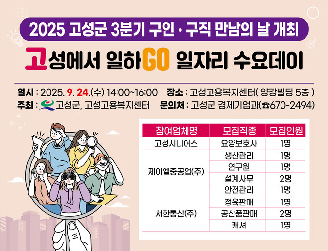 고성군은 오는 9월24일 오후 2시부터 4시까지 '2025 고성군 3분기 구인·구직 만남의 날 행사'를 고성고용복지센터에서 개최한다.
