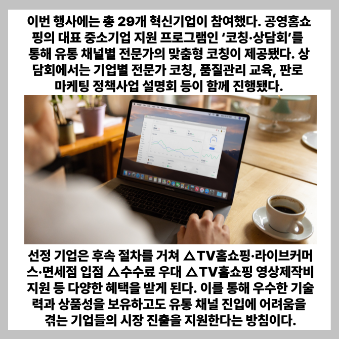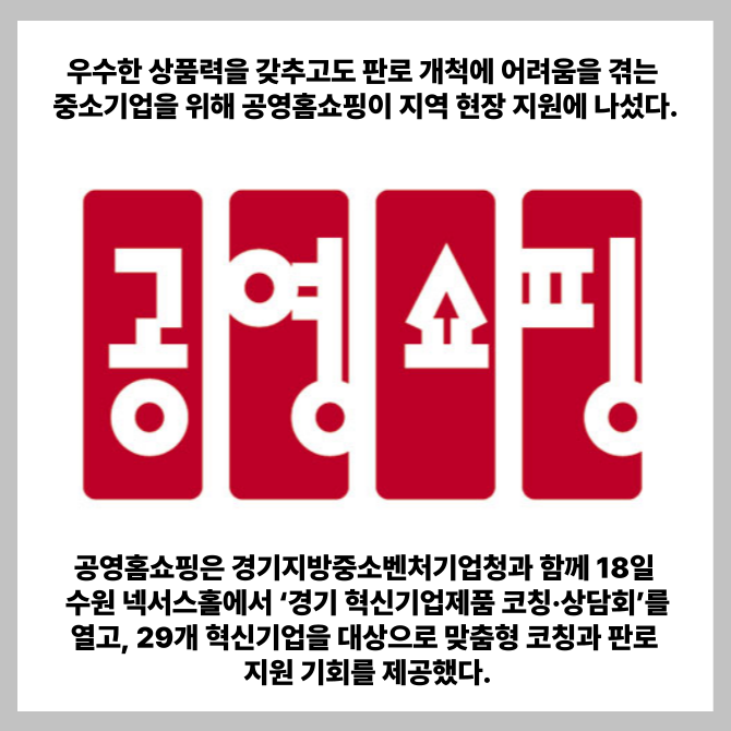 18일 공영홈쇼핑은 경기지방중소벤처기업청과 함께 수원 넥서스홀에서 '경기 혁신기업제품 코칭·상담회'를 열고, 29개 혁신기업을 대상으로 맞춤형 코칭과 판로 지원 기회를 제공했다.