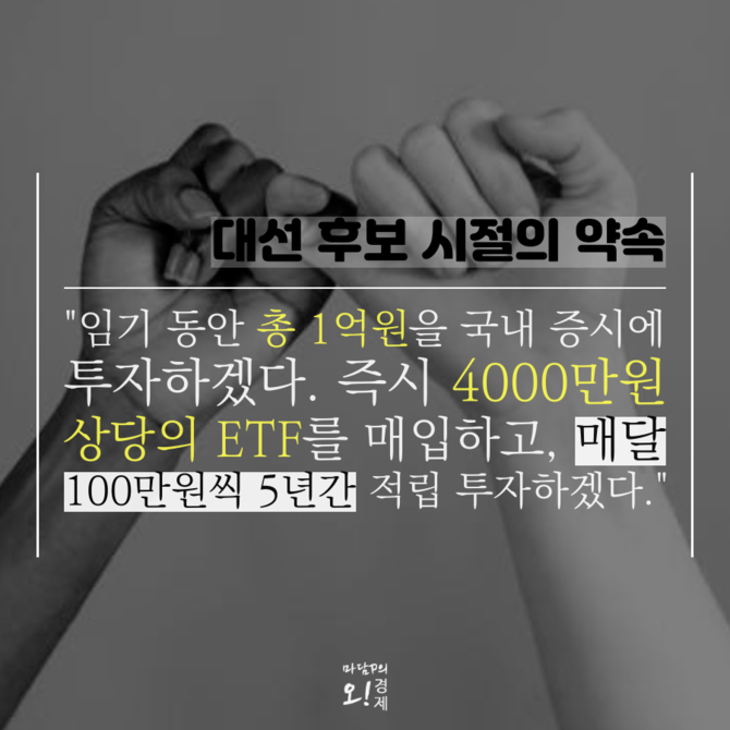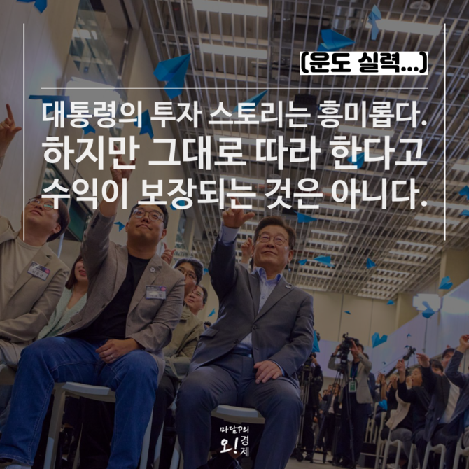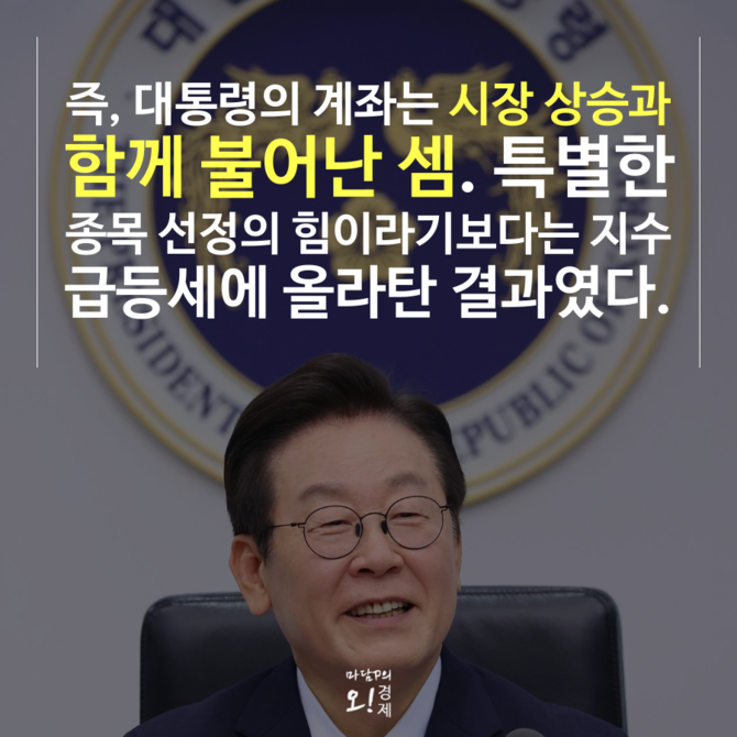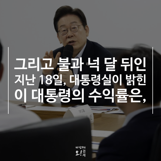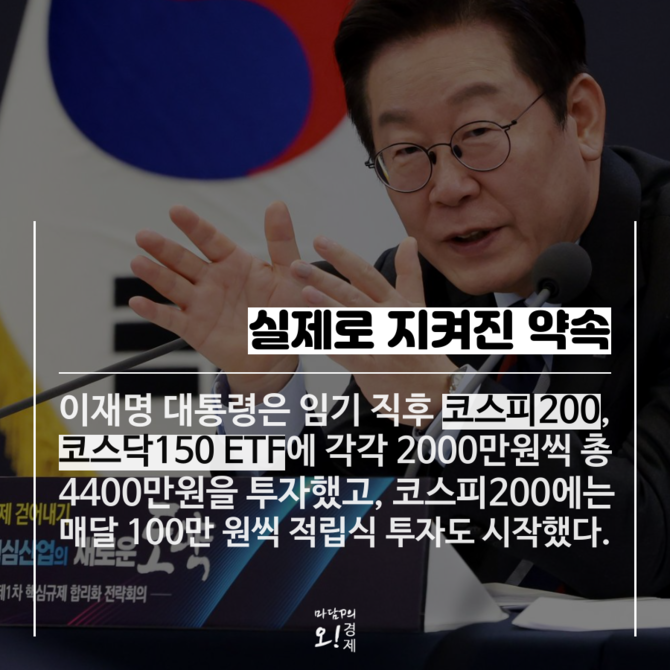 이 대통령은 대선 후보 시절 "임기 동안 총 1억 원을 국내 증시에 투자하겠다"며 매달 100만원씩 5년간 적립 투자 계획을 밝힌 바 있다. 대통령의 투자 성과는 시장 상승에 따른 효과라는 분석이 많지만 장기·분산 투자라는 메시지를 담았다는 점에서 상징성이 크다는 평가다.