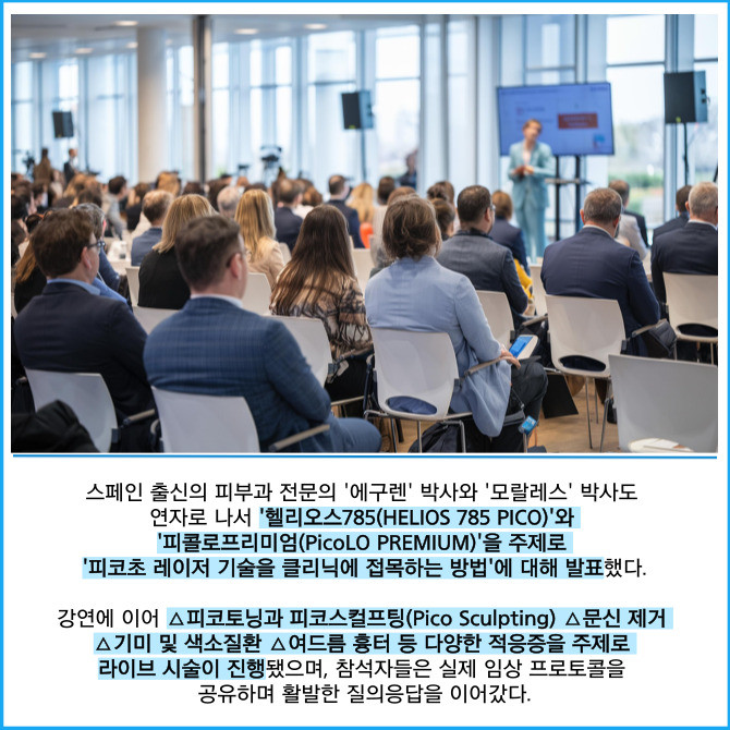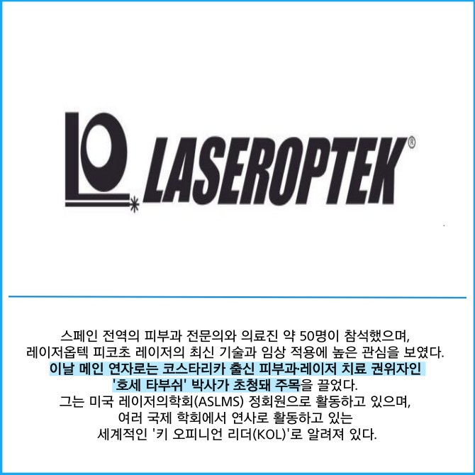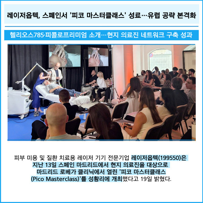 [프라임경제] 피부 미용 및 질환 치료용 레이저 기기 전문기업 레이저옵텍(199550)은 지난 13일 스페인 마드리드에서 현지 의료진을 대상으로 마드리드 로베가 클리닉에서 열린 '피코 마스터클래스(Pico Masterclass)'를 성황리에 개최했다고 19일 밝혔다.