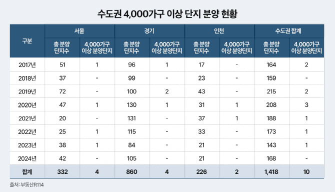 실제 2017~2024년 사이 수도권에서 분양한 1418개 단지 중 4000가구 이상 대규모 단지 분양은 전체 0.7% 수준(10곳)에 불과하다. 이마저도 가장 최근에 분양한 단지가 2023년 10월 서울 동대문구 '이문아이파크자이(4321가구)' 뿐이다.