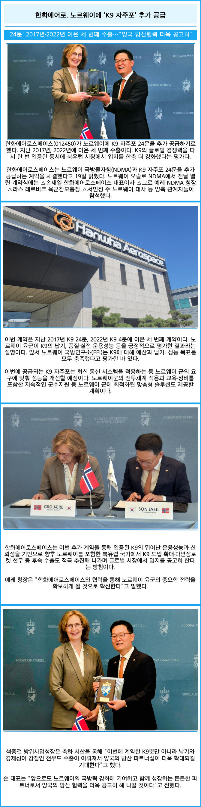 한화에어로스페이스는 노르웨이 국방물자청(NDMA)과 K9 자주포 24문을 추가 공급하는 계약을 체결했다고 19일 밝혔다.