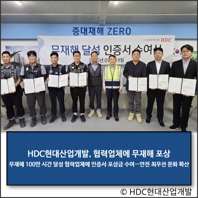 HDC현대산업개발(이하 HDC현산·294870)이 협력업체와 더불어 현장의 안전 관리를 강화하고 안전 최우선 문화 정착을 위해 무재해 달성에 이바지한 협력업체에 포상을 지급했다.